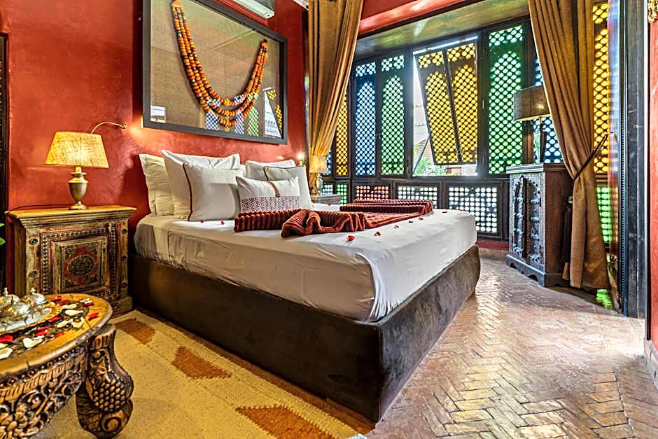 This air-conditioned room is decorated in traditional, Moroccan style with antique wooden furniture and warm, red tones. It features a fireplace, a furnished seating area and a private bathroom with bath or shower. It offers direct access to the terrace.