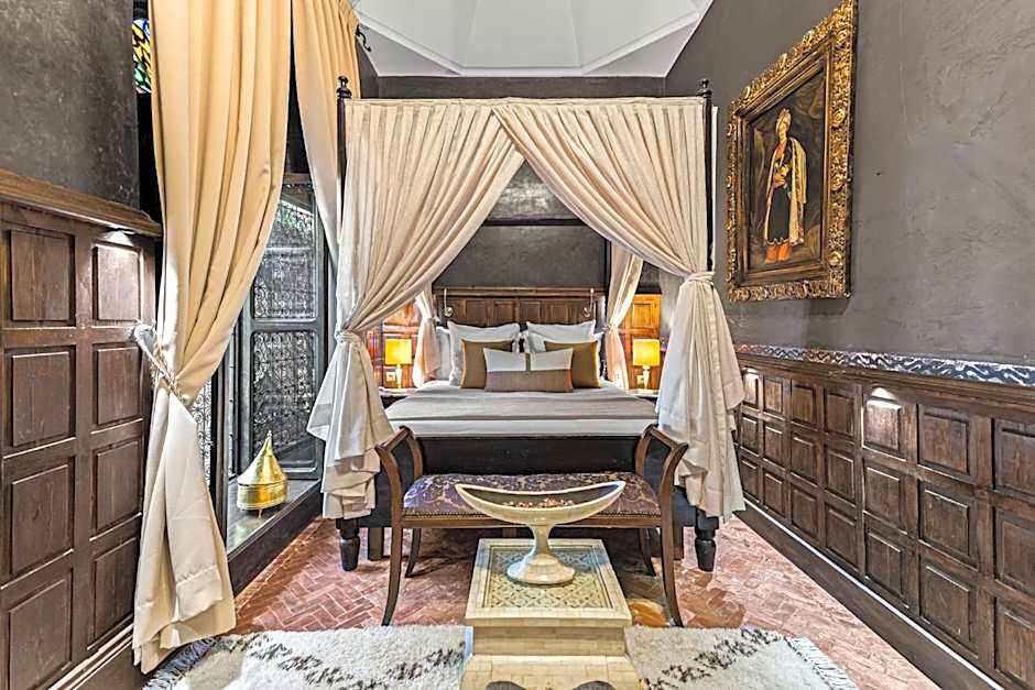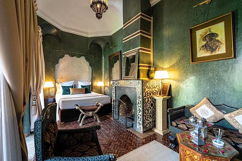 This air-conditioned room is decorated in traditional, Moroccan style with antique wooden furniture and kaki tones. It features a fireplace, a furnished seating area and a private bathroom with bath or shower.